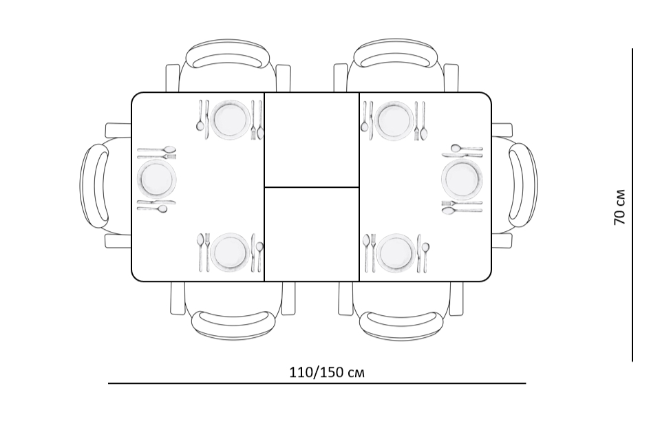 Размер стола компактный и в то же время достаточно вместительный для ежедневного использования 4 человек, по каждой стороне достаточно места чтобы поставить 4 широких стула вокруг стола. Механизм раздвижения со стеклянной вставкой позволяет комфортно посадить еще 2 гостей. Компактный и очень функциональный стол, идеален для использования как на небольшой кухне, так и в качестве уютной обеденной зоны в гостиной.